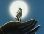 Shulato introduces himself, and then gets a look at his surroundings. His clothes are different and the land looks nothing like Tokyo. Everything is covered in lush, green foliage, and there are stone pillars and statues everywhere. There are islands floating in the sky, with rivers flowing off of them. Strange animals are everywhere. Shulato wonders where he is, then remembers that he was in a match with Gai. He runs around, calling for Gai, but to no avail. He sees a giant statue of a woman carved into a cliff and recognizes it as the woman he saw chanting. He asks Lakshu where he is. Lakshu asks if he has amnesia, then says he's in Tenkuukai. At first, Shulato doesn't quite get it. He thinks she means they're in space, and asks if Lakshu is an alien. Mii notices the Veda stuck in Shulato's belt. It looks like a stylized lion. Shulato asks Lakshu what it is.