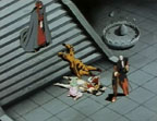 Hyuga dodges Indrah's first attack and calls his Valuda. Indrah still manages to knock him down the stairs. Gai is still trying to kill Shulato, and Shulato is still trying to reason with him. Shulato tries to use his Shakti, but can't remember the chant to transform! Finally, Lakshu runs in and reminds him. He transforms and fights back, knocking Gai through a wall. Lakshu runs to congradulate him. Shulato goes to find Gai, thinking that if he took him to Vishnu, she could turn him back to normal. Gai is waiting for him. He casts a Shippu Marouken, knocking Shulato through not one, but two walls. Indrah and Hyuga are still fighting. Hyuga transforms, but even with his Shakti, he can't even get close to Indrah. Indrah knocks Hyuga down the stairs again.