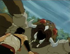 Lakshu's scream distracts Hyuga and Renge's whip nails him in the face.