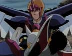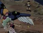 The heroes fly across the lake toward Shutentou on their Valudas. Shutentou is strange island. The sides are sheer cliffs, several hundred feet high. The only way up, aside fron flying, is a series of stair-like platforms floating near one side. Shulato is waterskiing behind his Valuda, with Lakshu cheering him on. Hyuga and Ryouma are watching him as if they think he's lost his mind. Reiga is annoyed at his lack of seriousness. Shulato says he shouldn't have to be serious all the time. Finally fed up, Reiga throws a feather, breaking the rope that connected Shulato's board with his Valuda.